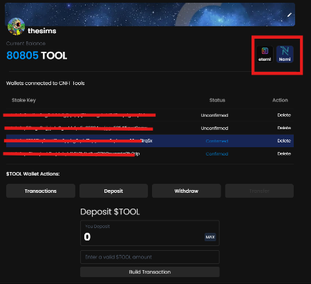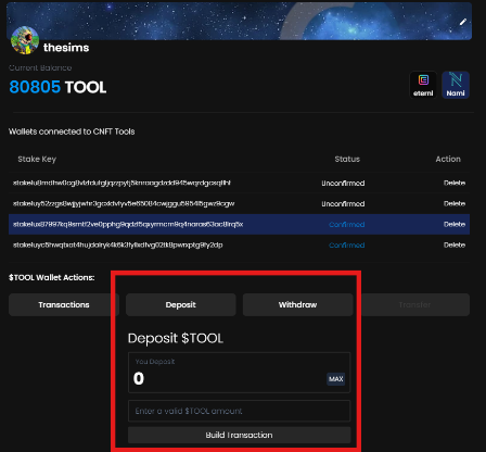 Simply, type in the amount you want to deposit and click build transaction. This will prompt a transaction for you to sign to move the $TOOL from your ADA wallet into your Hot wallet.&#x20;